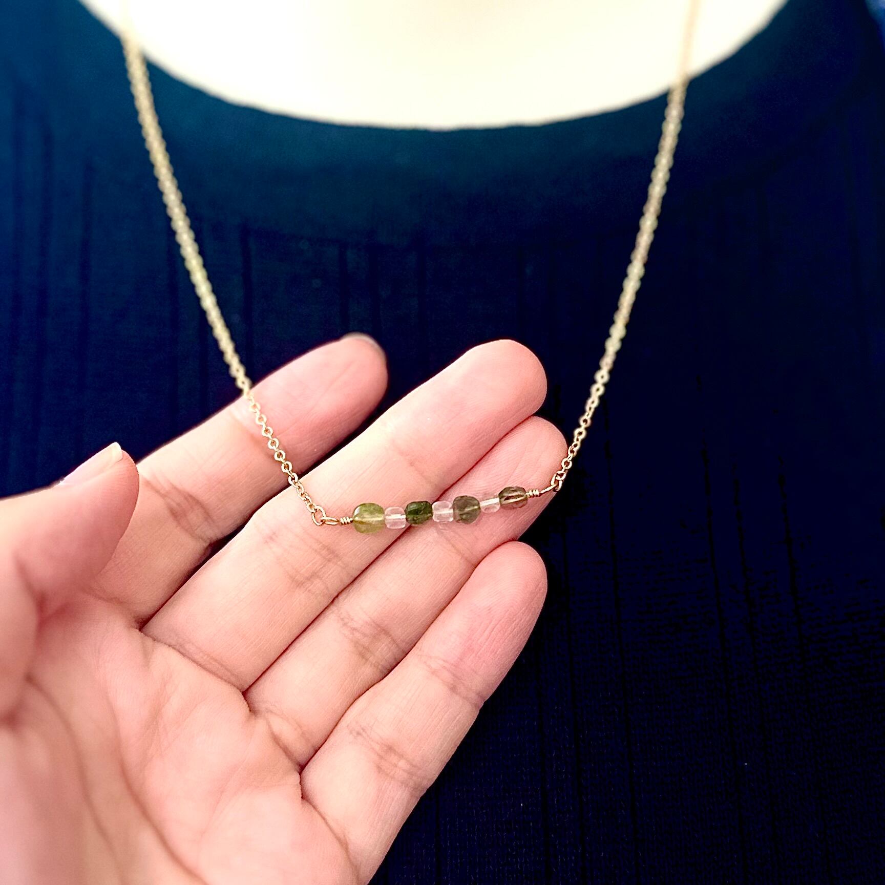 清らかで優しい透明感と、生命力あるグリーンの対比が魅力で空気の澄んだ森の中で癒されるようなネックレス