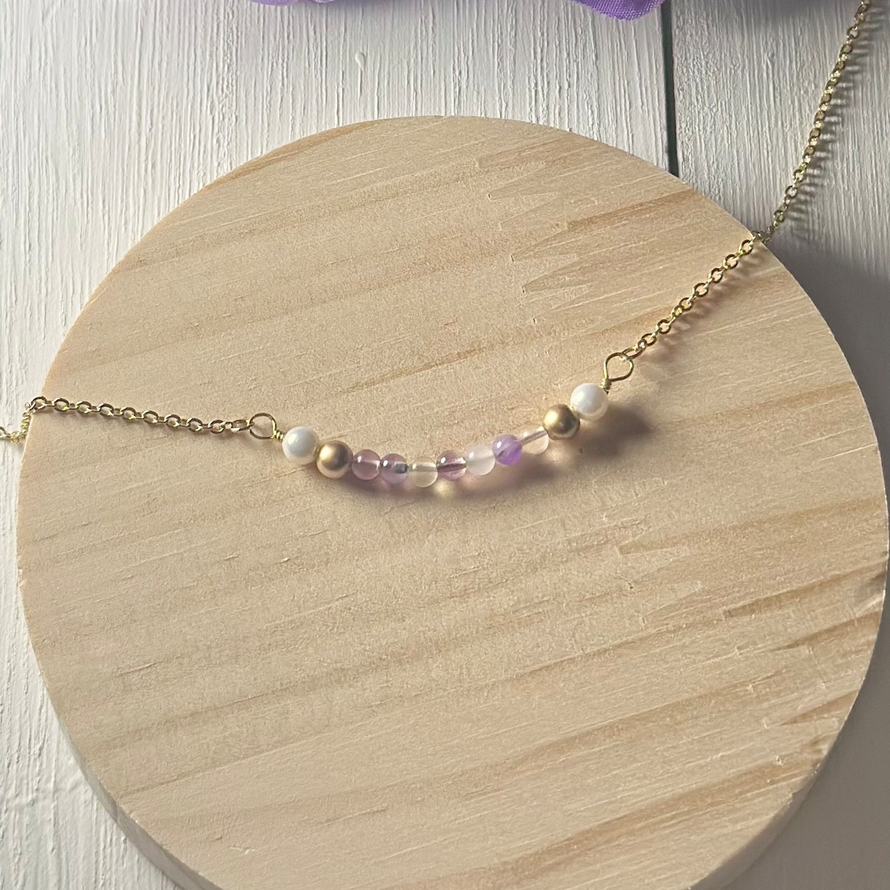 淡い紫と透明のグラデーションが美しいフローライトに、柔らかな光を放つ白とゴールドの樹脂パールを添えて、品のあるやさしさをまとったネックレスに仕上げました。