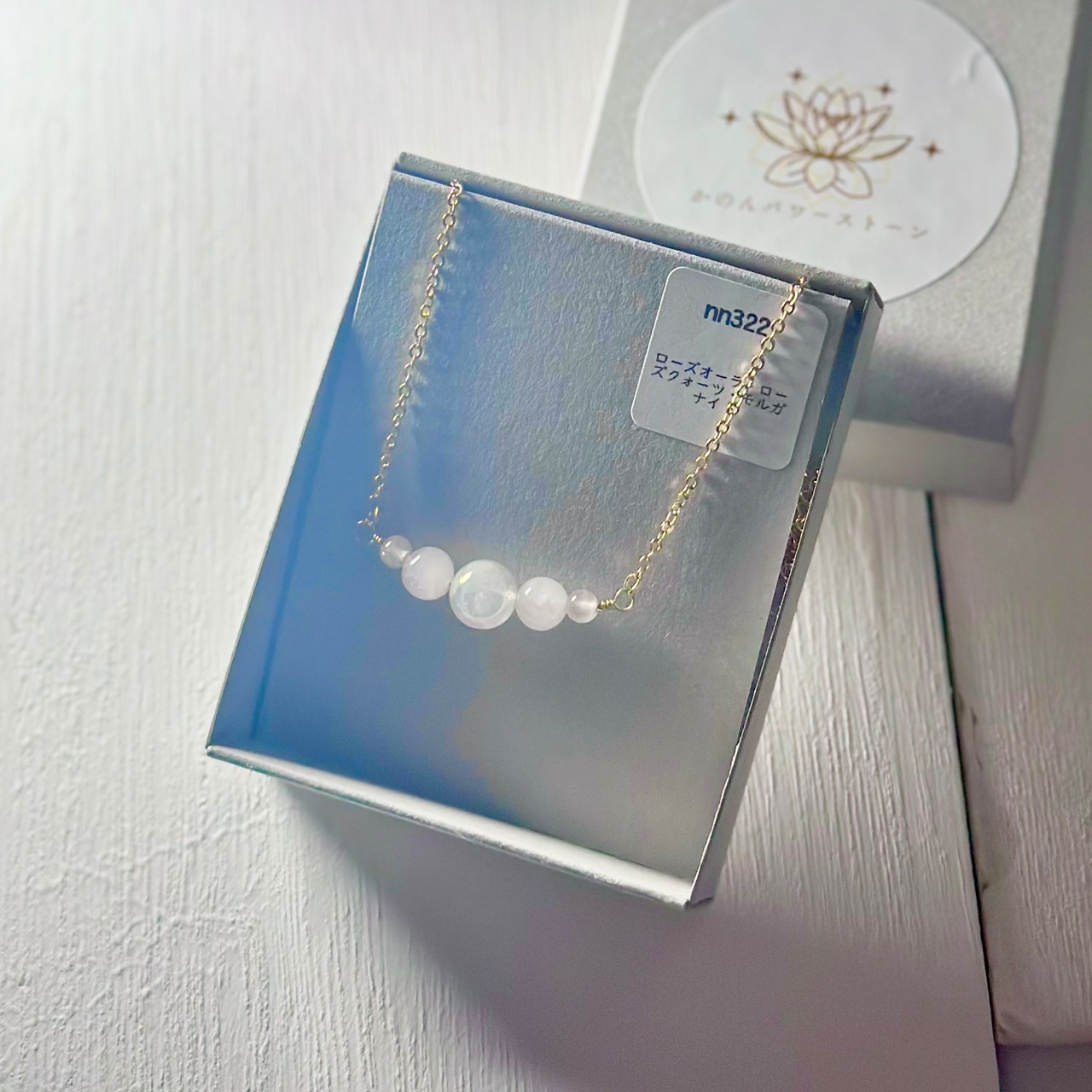 すべてが淡くやさしい色合いで、まるで「大丈夫だよ」とそっと抱きしめてくれるようなネックレスです。
