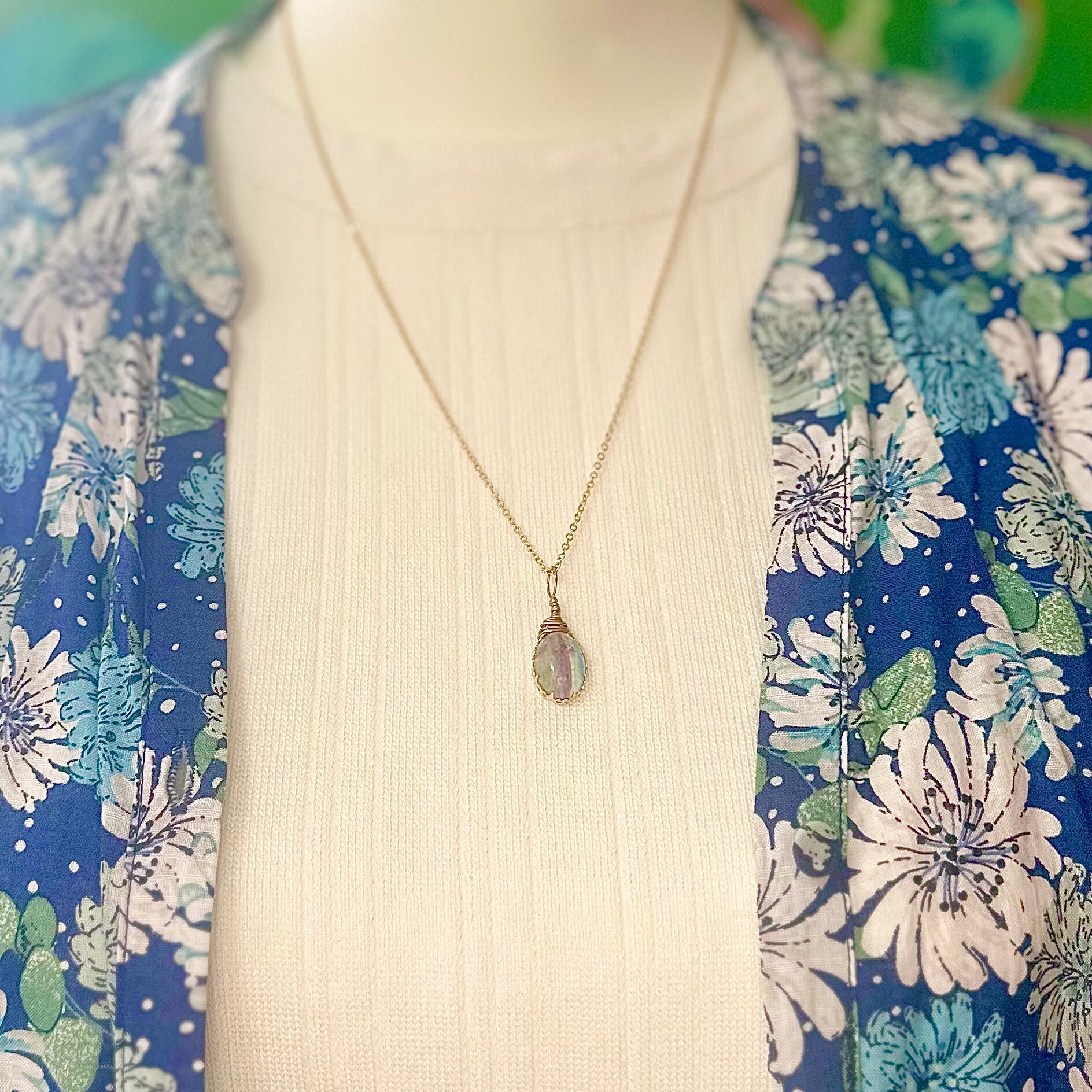 2種類の真鍮ワイヤーを使い、ナチュラルなカボションを活かして穴を開けずネックレスに仕上げています