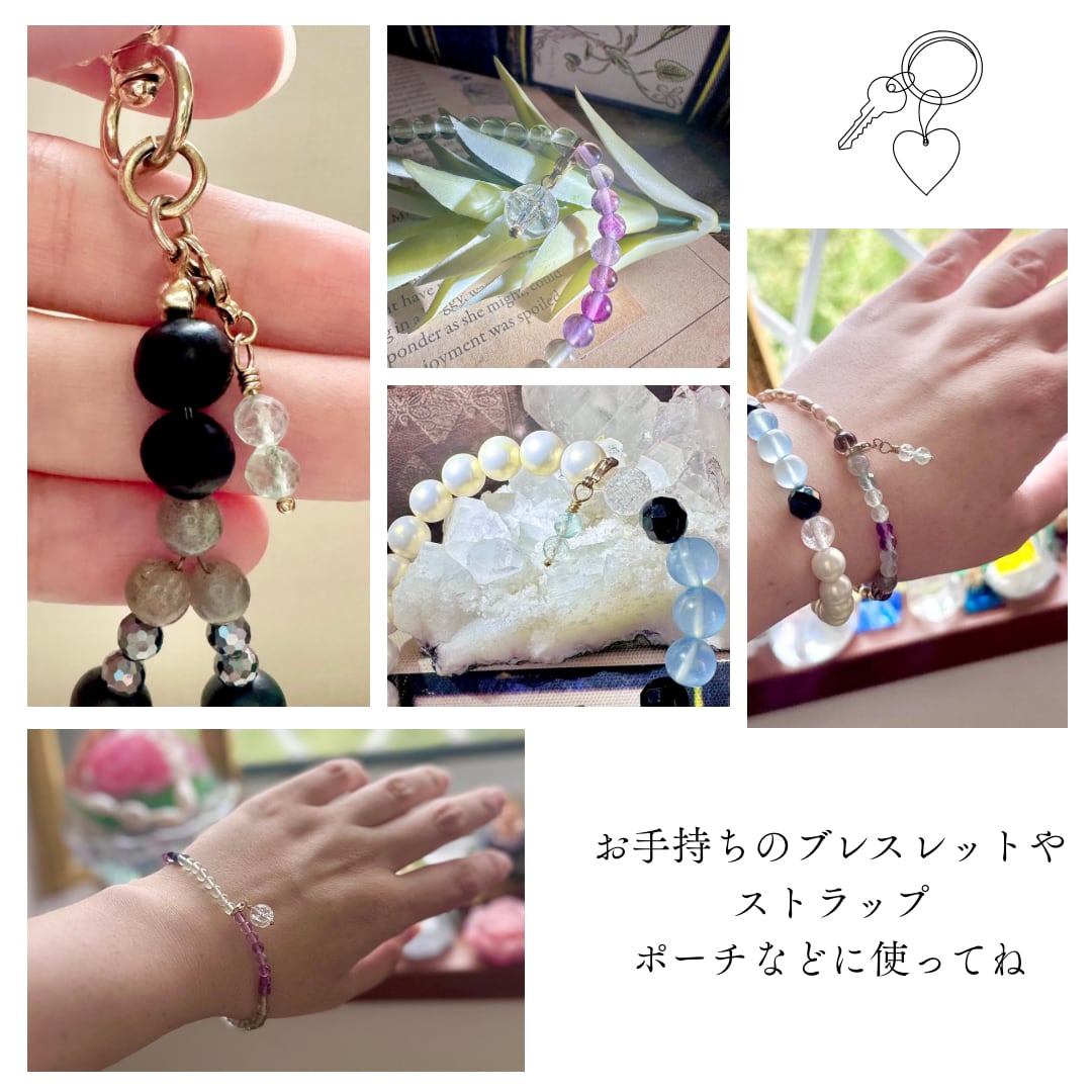 ⇒ バッグ・ポーチ・鍵・スマホストラップ、お手持ちのブレスレットなどに付けてお楽しみください。