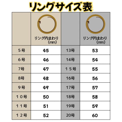 サイズ選びに迷う場合は、普段お使いの指輪の 内周(mm) を測っていただくと安心です。