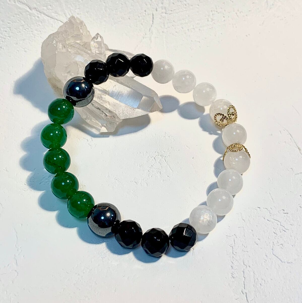 【1点物】《パワーストーンブレスレット》 翡翠 ムーンストーン オニキス 黒×緑×白 気分で変えられる3WAYデザイン