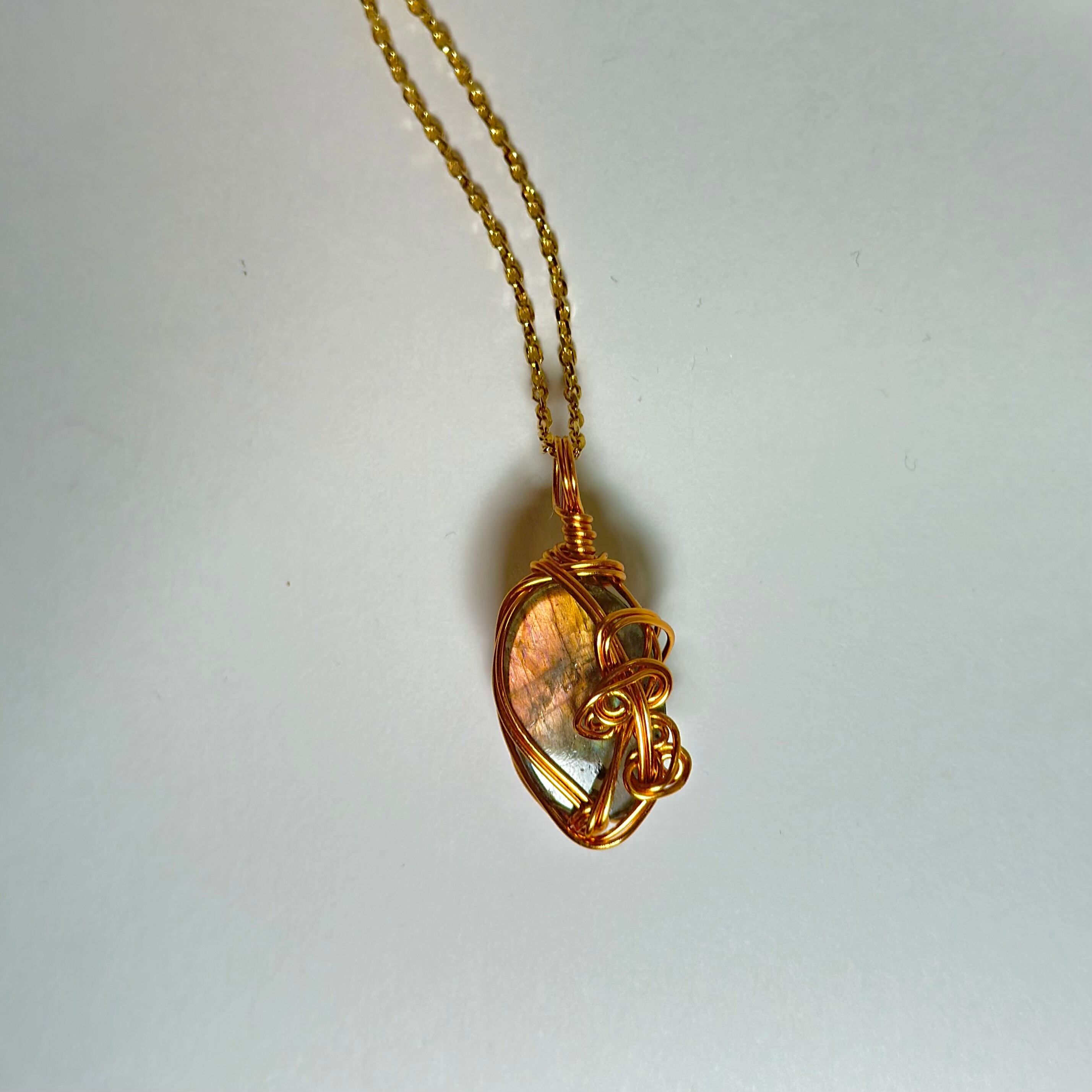 ▪️オーダー様専用▪️天然石【大粒ラブラドライト(オレンジ) ネックレス】とオレンジムーンストーンの耳飾りのセット『個性的真鍮ワイヤー巻き』オーバルカット〜あなただけのメッセージ付き
