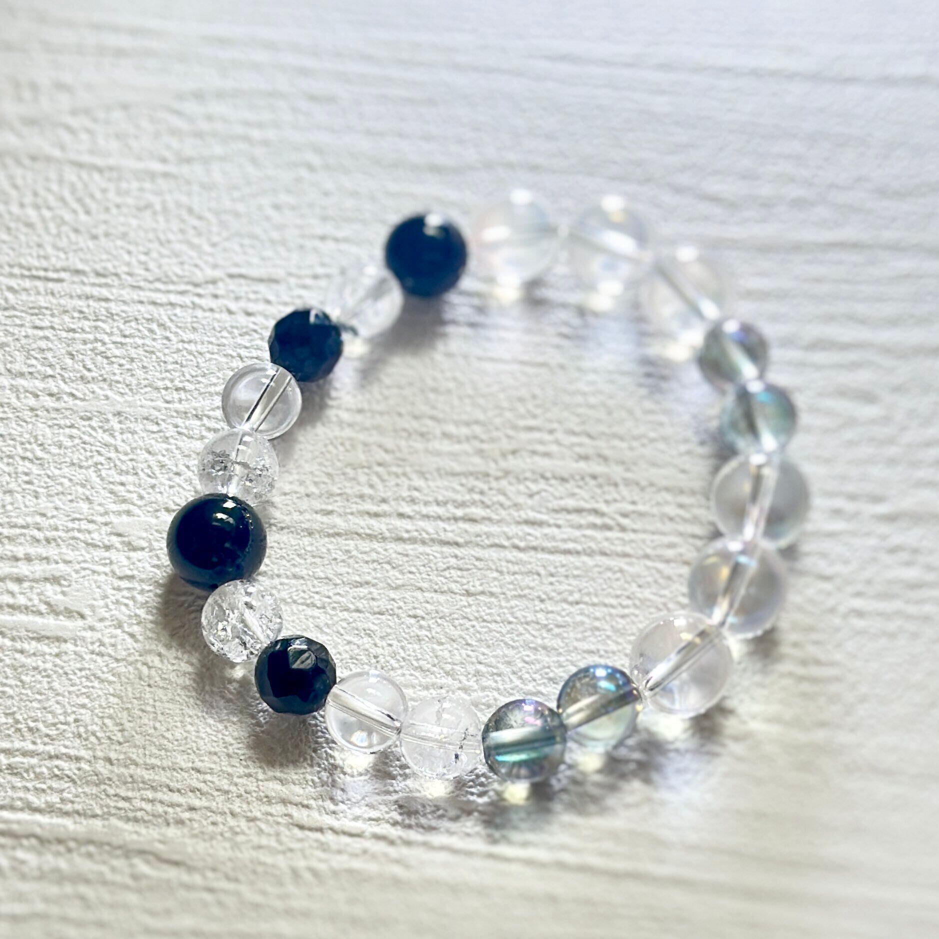 【SALE☆彡】天然石ブレスレット【透明×黒 オニキス 水晶 オーラ加工】一点物〜あなただけのメッセージ付き
