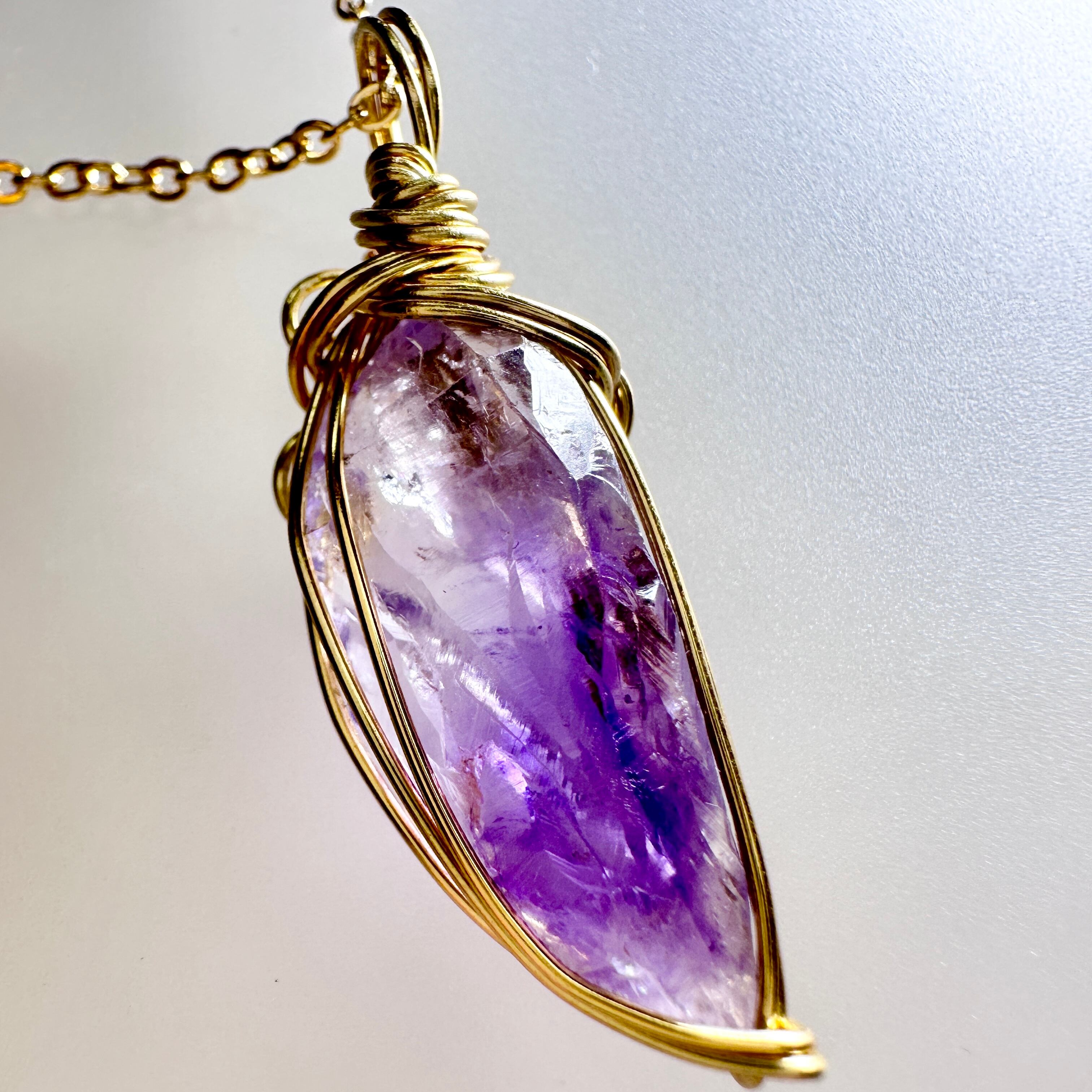 天然石【大粒アメジスト】原石 結晶(2月誕生石)ネックレス一点物 『個性的真鍮ワイヤー巻き』〜あなただけのメッセージ付き